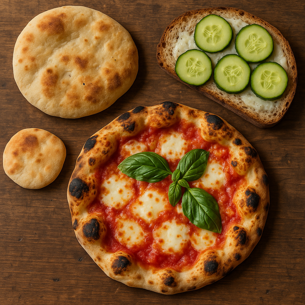 - Równoległe „flatbready”: od tysiącleci wypiekano cienkie placki z ziołami, oliwą czy mięsem (np. grecka pita, rzymska focaccia-like, bliskowschodnie lahmacun/pide, alzacki flammkuchen). To wspólna kategoria technik wypieku, ale z innymi dodatkami i metodą serwowania.