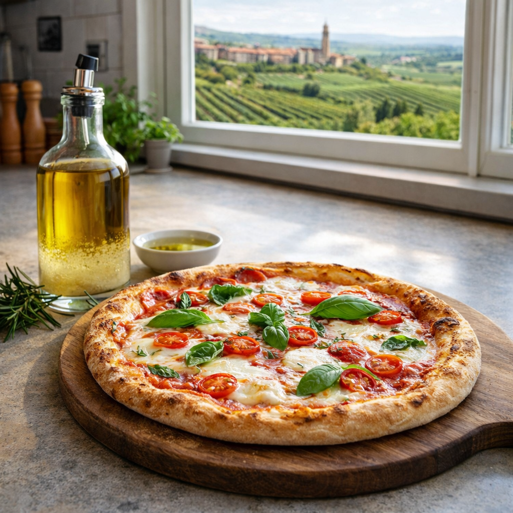 Pizza Tonda Romana to klasyk kuchni rzymskiej, który łączy prostotę składników z wyjątkową techniką przygotowania ciasta. Jest to pizza pieczona w bardzo wysokiej temperaturze (nawet do 300°C), dzięki czemu ciasto szybko się wypieka, zachowując lekkość i chrupkość bez zbytniego obciążenia.